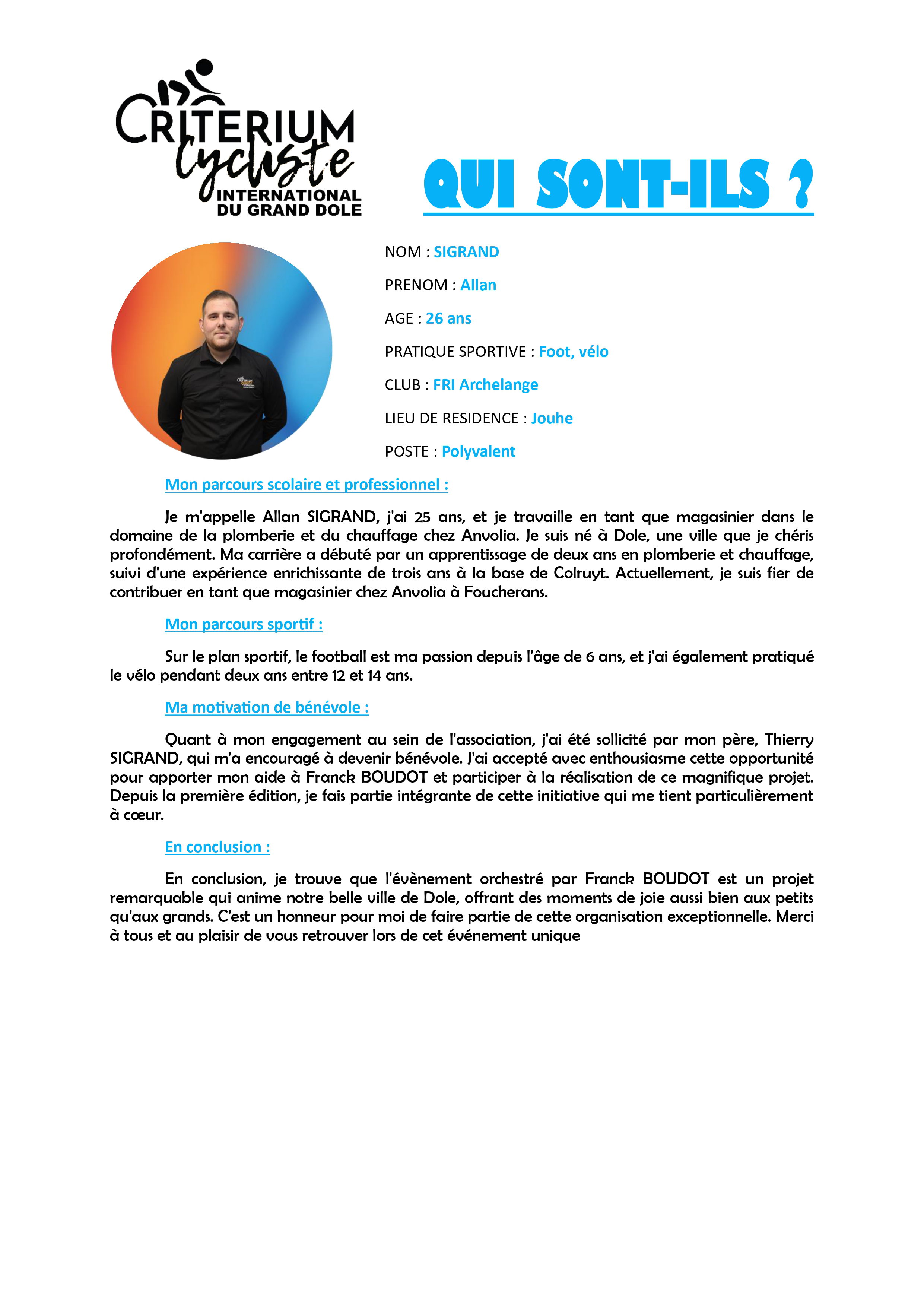 Mein Vater, Thierry SIGRAND, kam auf mich zu und ermutigte mich, ehrenamtlich zu arbeiten. Ich habe diese Gelegenheit, Franck BOUDOT zu helfen, mit Begeisterung angenommen...